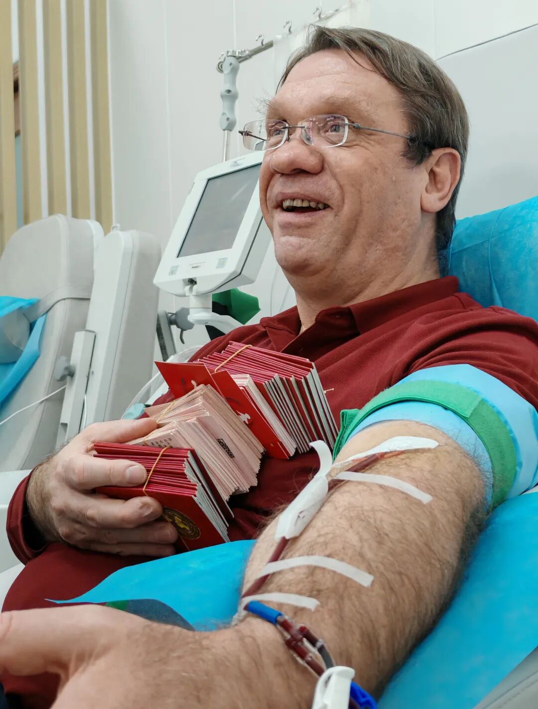 起初,老皮是在獻血車上捐獻全血,每半年獻一次。后來,他了解到,如果捐獻血小板,就可以每隔兩周獻一次。從那以后,只要沒有特殊情況,他每月都會到天津市血液中心兩次,每次獻兩個治療單位的血小板,一年獻滿24次。