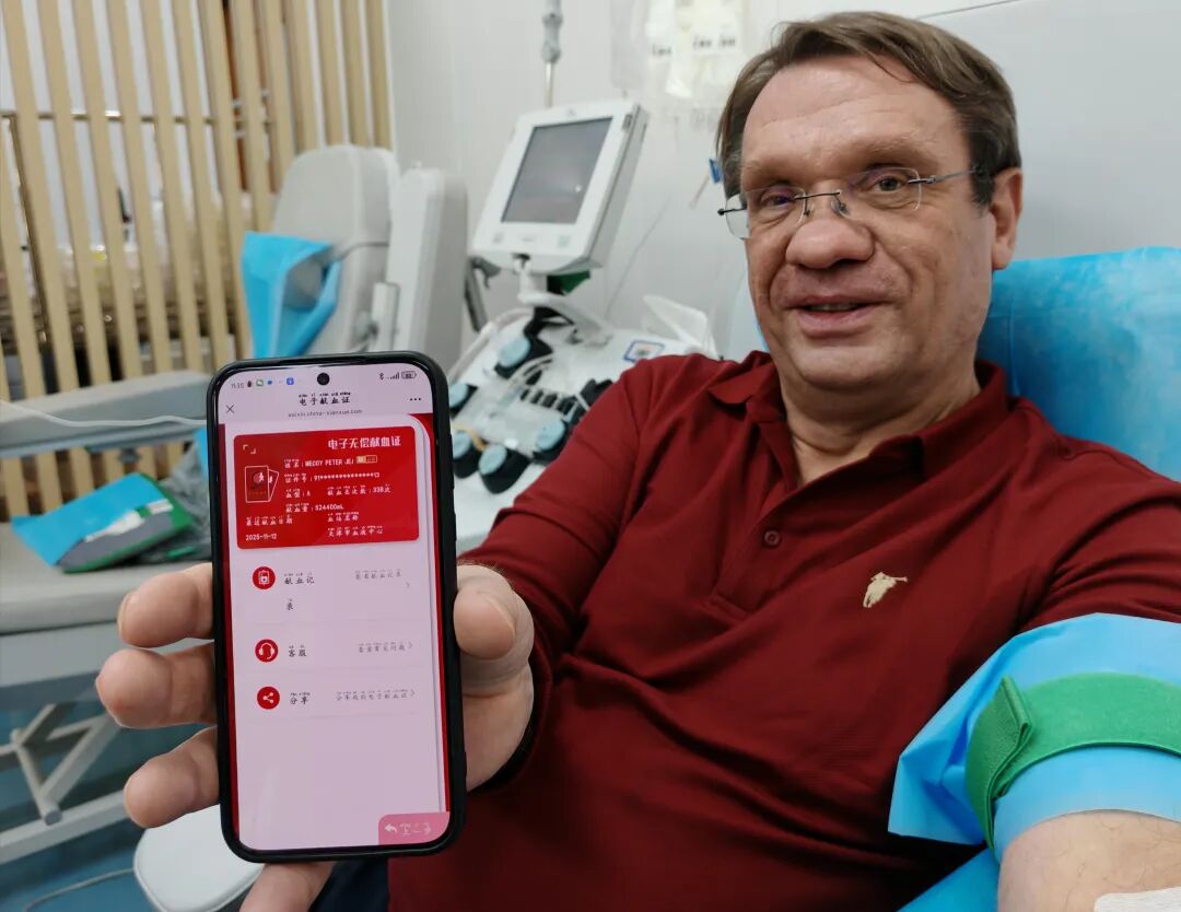 老皮在中國獻血的淵源,還要從2008年說起。那一年,一次偶然機會,他在天津站前廣場上看到有關(guān)無償獻血的中英文宣傳,當時便留了心。幾天后,他又在天津圖書大廈附近看到獻血車,與工作人員確認可以獻血后,立刻擼起袖子,獻了400毫升全血,正式開啟他在天津的無償獻血之路。